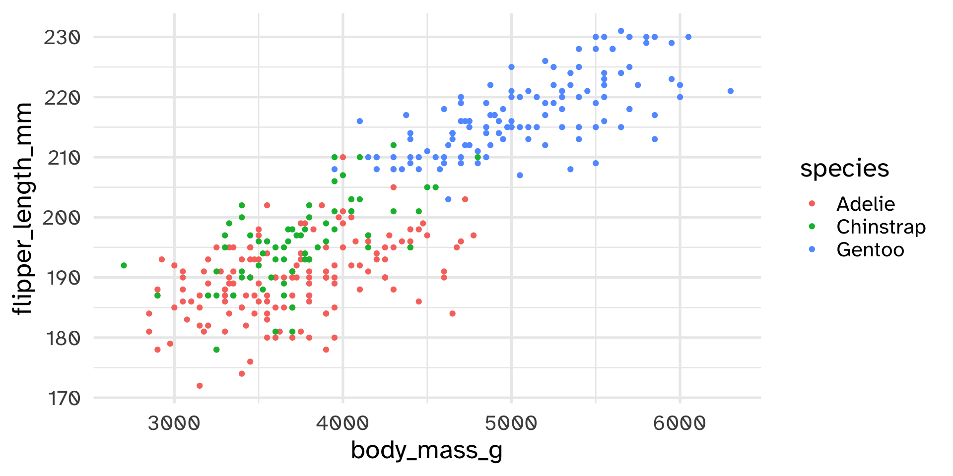 ggplot(penguins, aes(x = body_mass_g, y = flipper_length_mm, col = species)) +