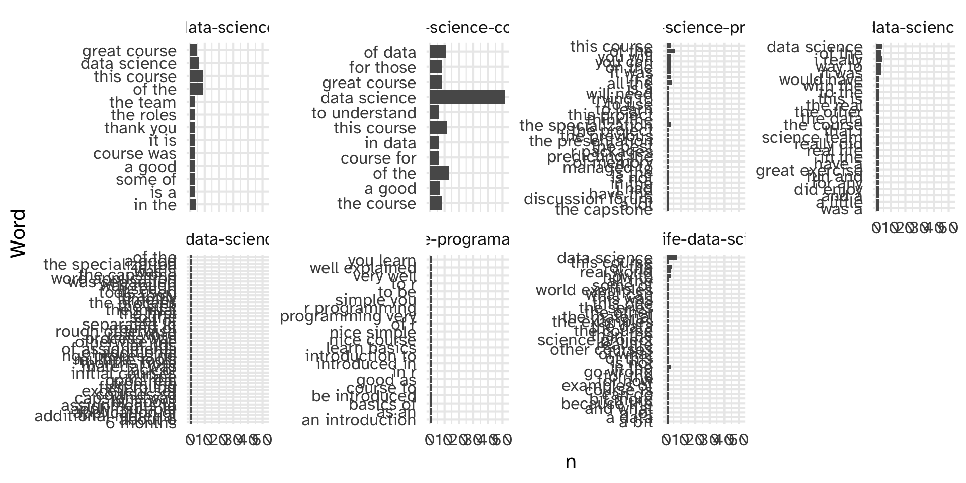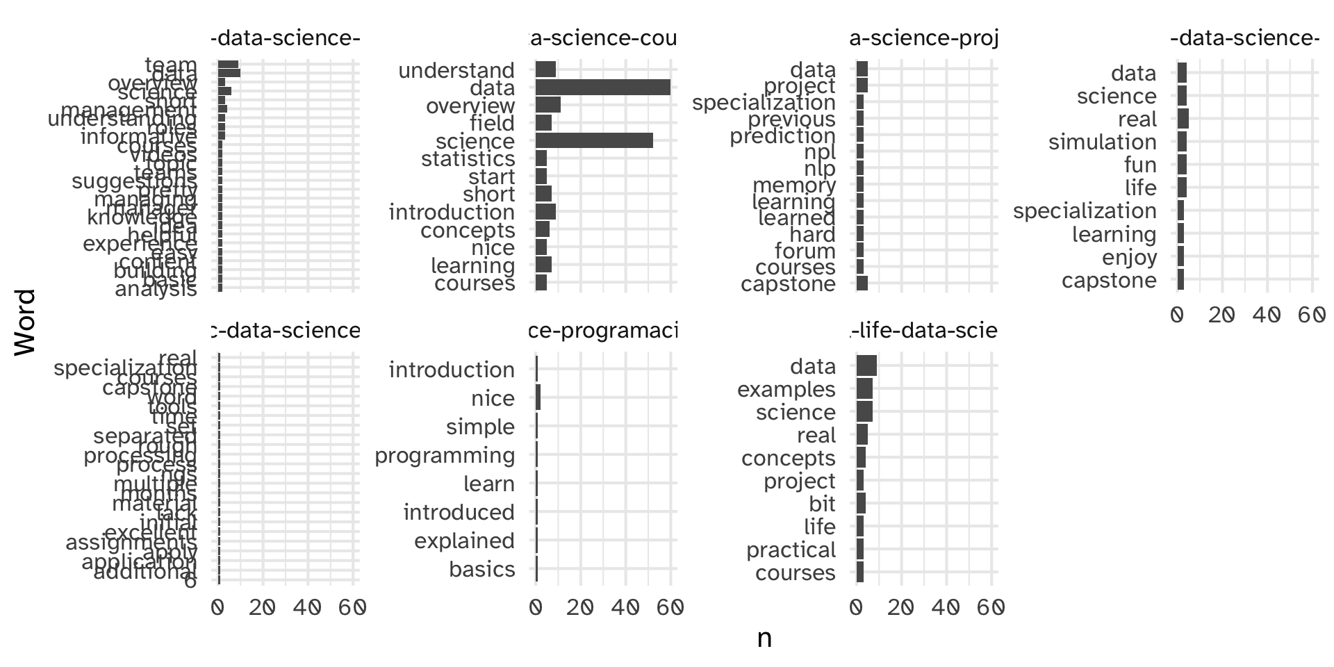 [6] "This course provides a great overiew to introductory R programming. Since taking the course, I have successfully used the precepts learned here for a number of analysis projects. Coupled with ggplot2 graphics, the results became self-evident."
