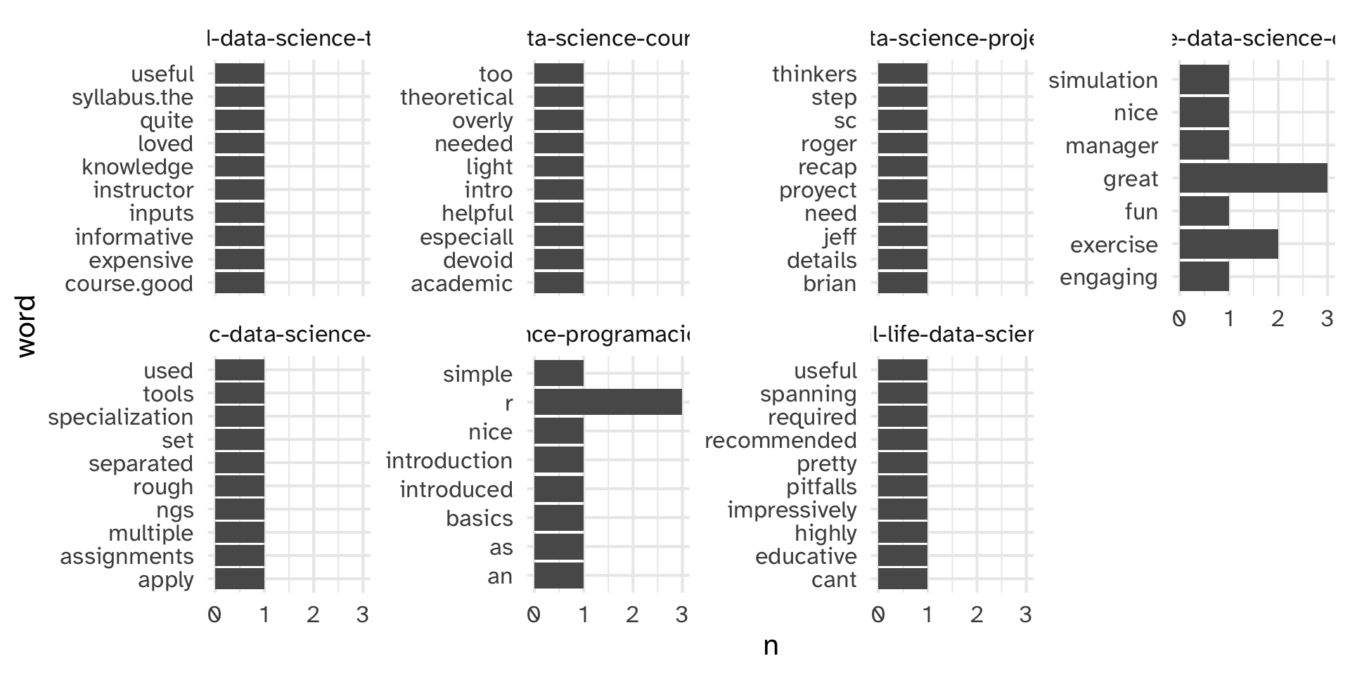 [2] "Good course on plotting libraries and useful plots in R. Wished there was more coverage of ggplot and less on lattice, but overall a useful course."